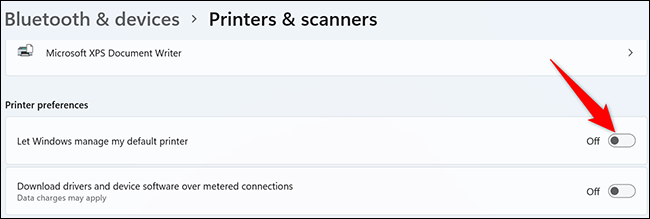 将“打印机和扫描仪”页面滚动到底部。在那里,禁用“让 Windows 管理我的默认打印机”选项。如果启用此选项,Windows 将不允许您设置默认打印机。