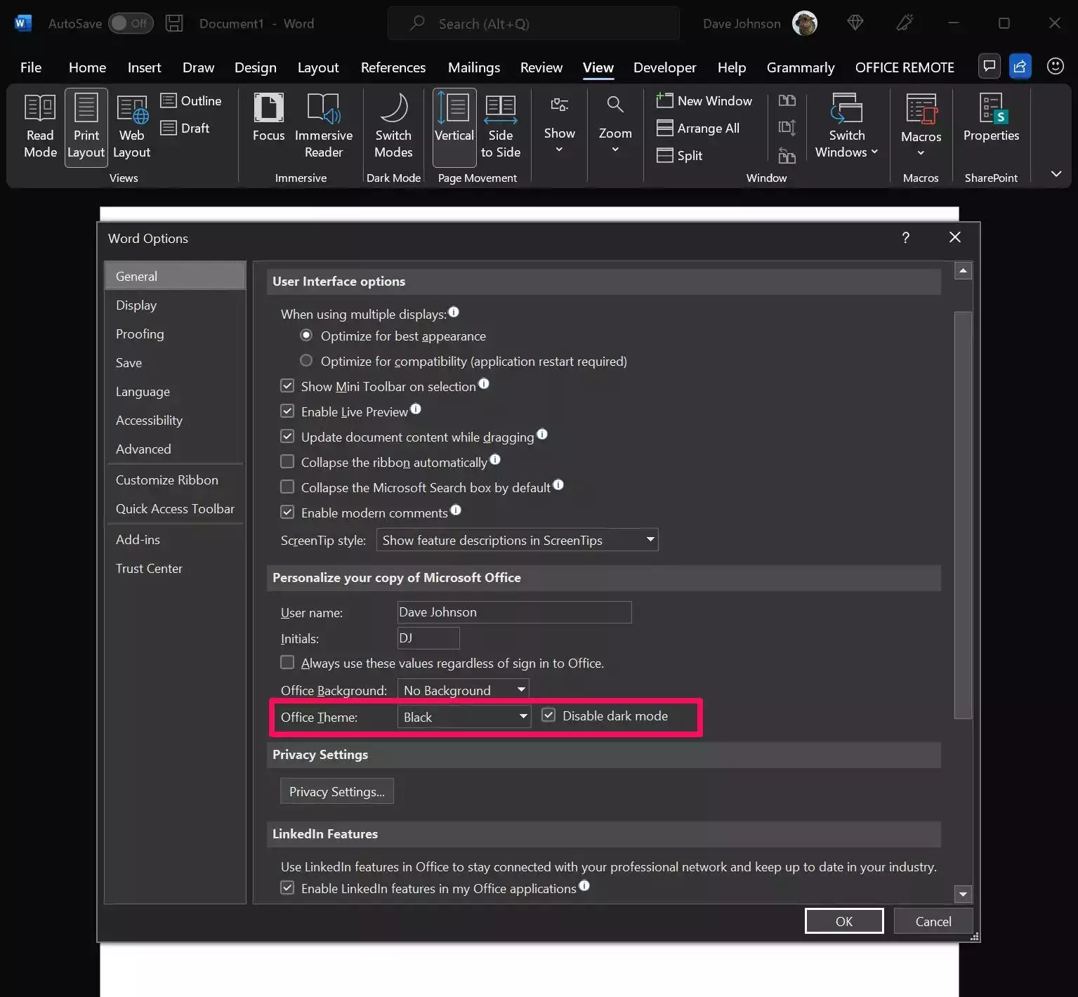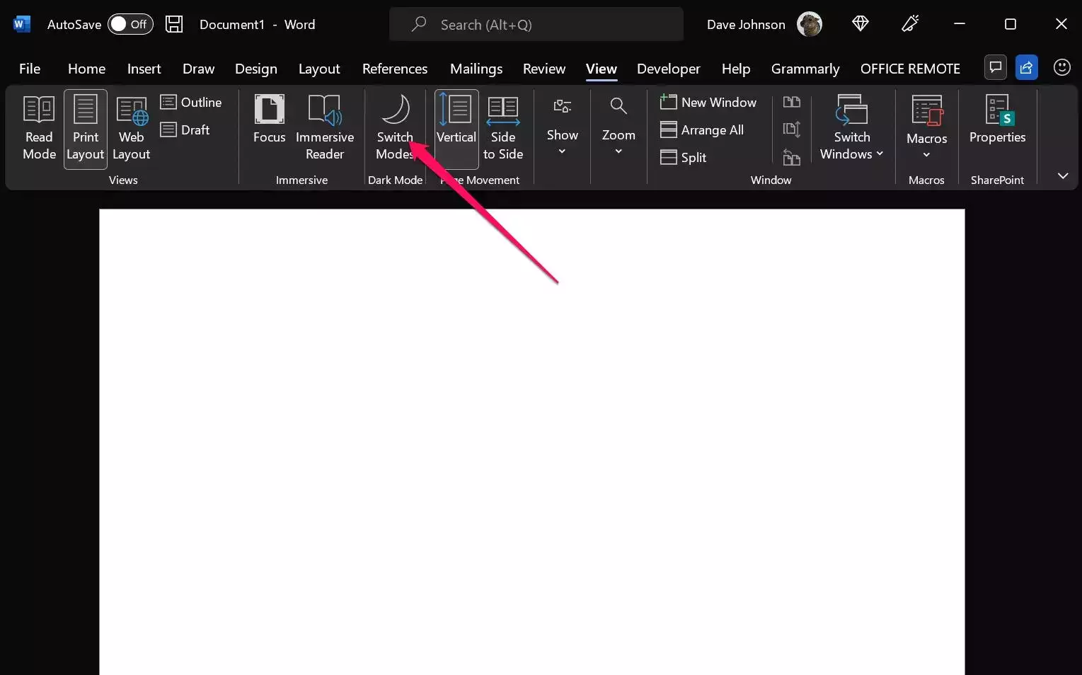 现在,即使在黑暗模式下,Word 也将始终以白色文档开头。请记住,您仍然可以通过单击“视图”选项卡中的“切换模式”将文档切换为黑色——这会覆盖“禁用暗模式”复选框。