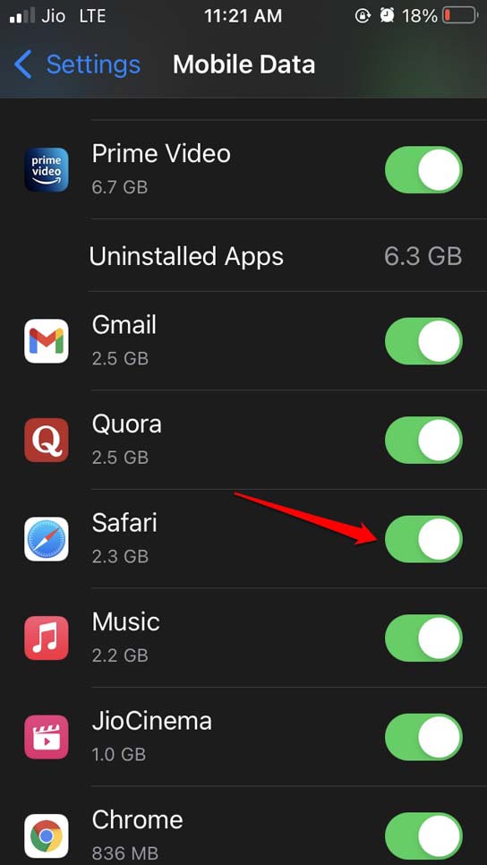 - 确保点击 Safari 旁边的开关以启用应用程序的蜂窝数据。
