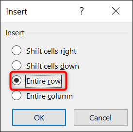 您将在屏幕上看到一个小的“插入”框。在此框中,启用“整行”选项并单击“确定”。