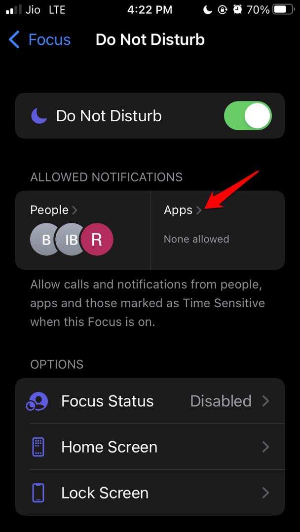 检查您接收通知的应用程序是否已列入白名单。除非您已将应用列入白名单或允许应用向您显示通知,否则在指定的无干扰时间内,焦点模式不应允许它。因此,您需要检查并确保您要限制的应用程序被禁止显示通知。