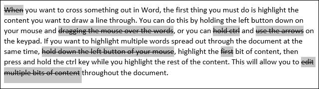 应用删除线格式非常简单。首先选择要删除的文本。您可以通过单击并拖动文本(或只是双击一个单词)来完成此操作,但是当您执行此操作时,Word 也喜欢选择文本后面的空格。如果您不希望发生这种情况,请单击以将插入点置于文本的开头,然后按住 Shift 键并单击文本的末尾以获得更精确的选择。