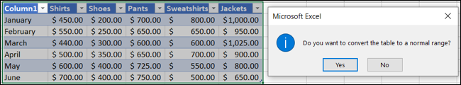 使用上述任何一种方法,您都会收到一条弹出消息,要求您确认。单击“是”继续或单击“否”将数据保留为表格。