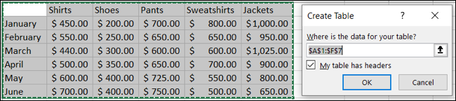 在任一情况下,系统都会提示您确认将数据范围转换为表格。此外,如果您的数据具有要使用的标题,请选中该框。单击“确定”。