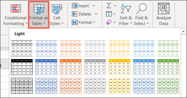 选择要转换的单元格范围,然后有两个选项可以继续。首先,在主页选项卡上,您可以单击功能区样式部分中的“格式为表格”。选择要使用的表格样式。