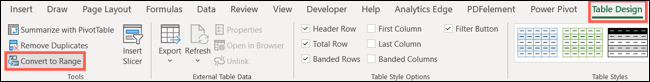 选择表格中的任何单元格,然后您可以执行以下两项操作之一。您的第一个选择是,在显示的“表格设计”选项卡上,单击功能区“工具”部分中的“转换为范围”。