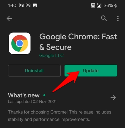 它将在您的 Android 设备上重新安装 Google Chrome 浏览器。虽然它不是完全重新安装,但降级到其最早版本并安装最新版本是最接近 Android 智能手机的方法。