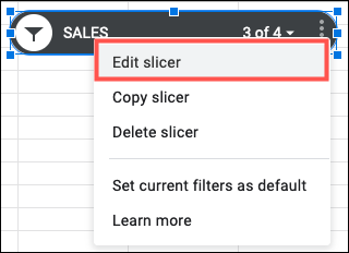 您可以更改切片器的数据集、过滤器列或外观。选择切片器,单击它右上角的三个点,然后选择“编辑切片器”。