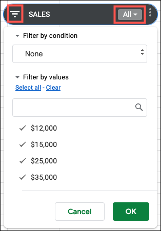 单击切片器上的过滤器图标或下拉箭头,将过滤器应用于该列。您将看到您可以按条件过滤,例如包含关键字或大于特定数量的值的文本。您还可以通过取消选择您不想要的值来按值过滤,留下您想要的值。