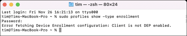 您可以使用终端命令检查设备的 ADE/DEP 注册状态,但您需要管理员访问权限(因此所有者需要输入管理员密码才能运行命令)。打开终端并输入: