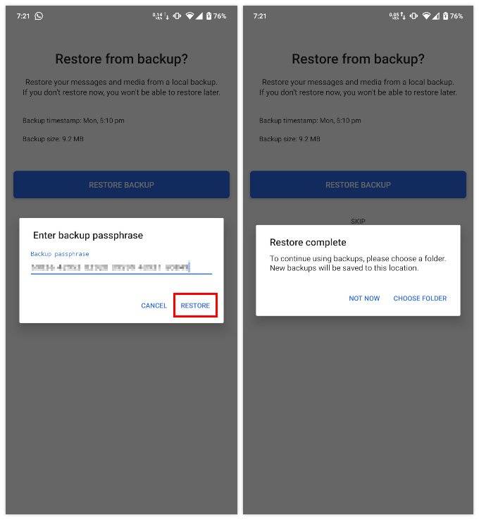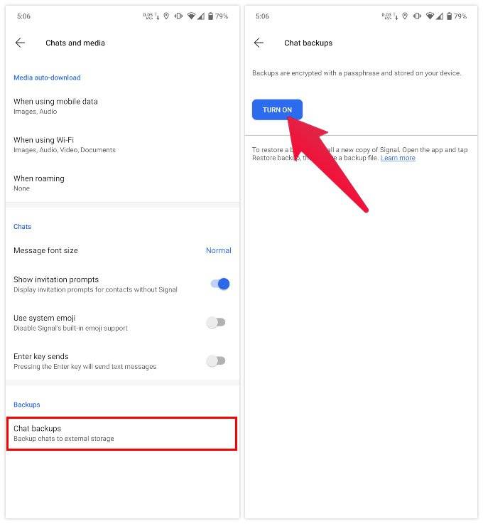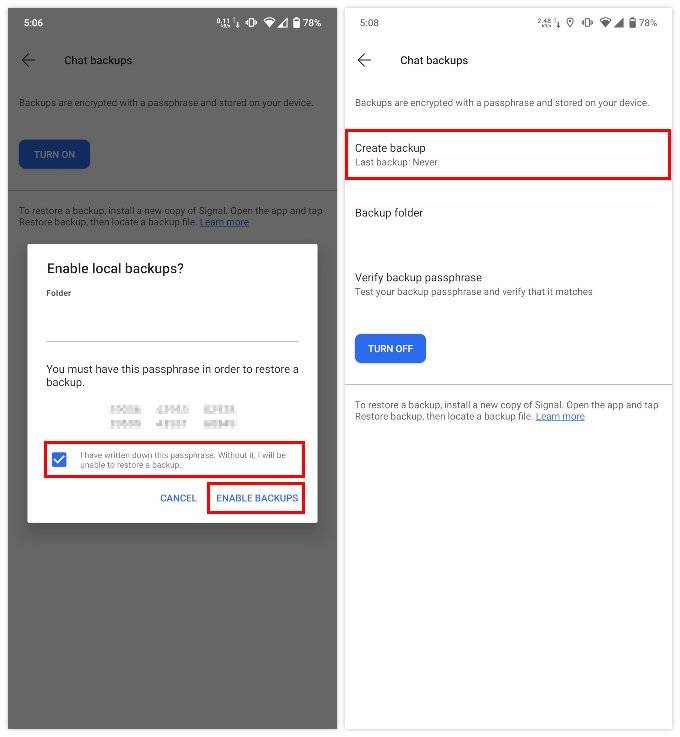 请确保密码短语的安全性,因为如果密码丢失,您将无法访问所有Signal聊天数据。备份存储在本地设备上先前选择的文件夹中。因此,如果丢失备份文件,则将丢失数据。