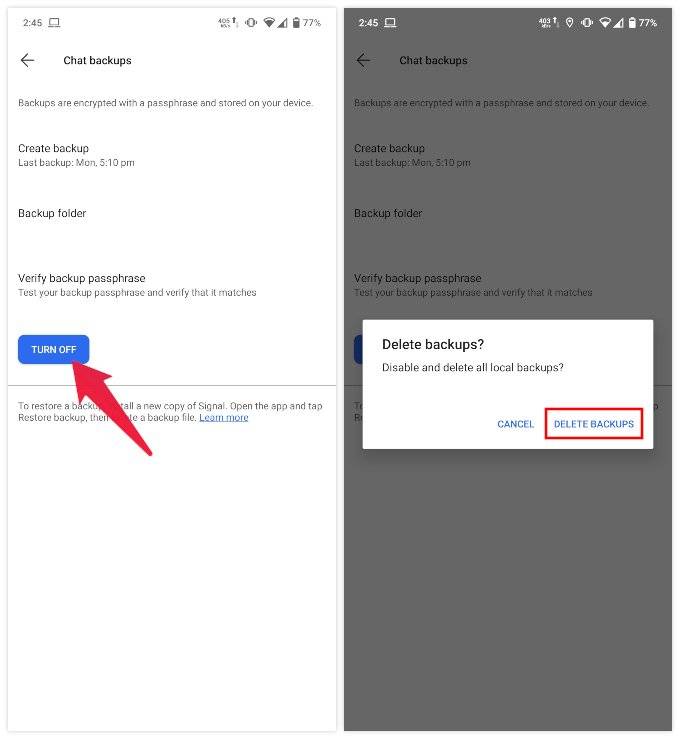 只需转到信号 设置>聊天 和 媒体>聊天 备份,然后点击“关闭”按钮。接下来,在弹出对话框中选择DELETE BACKUPS,然后按照上述步骤创建新备份。