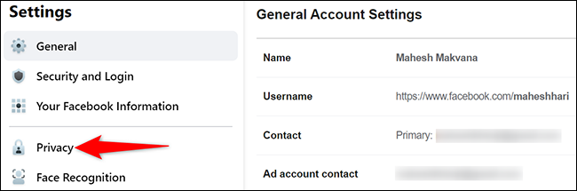 您将到达“设置”页面。从左侧的侧边栏中,选择“隐私”。这将打开Facebook 的隐私设置页面。