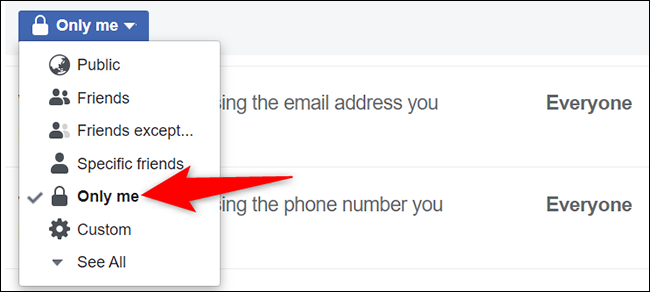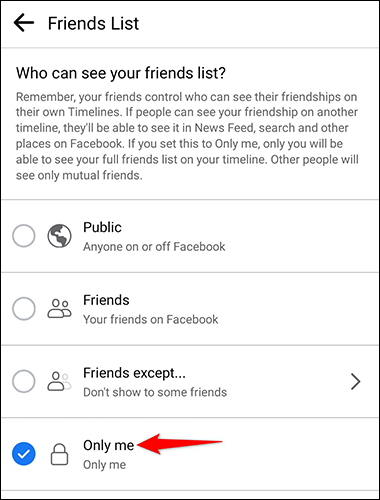 如果您想对所有人隐藏您的朋友列表,请从下拉菜单中选择“仅限我”。这确保只有您可以查看好友列表。