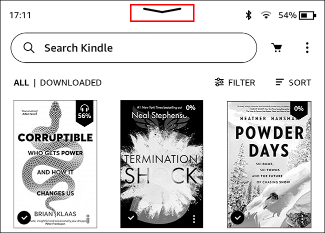 如果您看到飞行符号,则表示您的 Kindle 处于飞行模式。点击屏幕顶部的箭头以打开菜单。