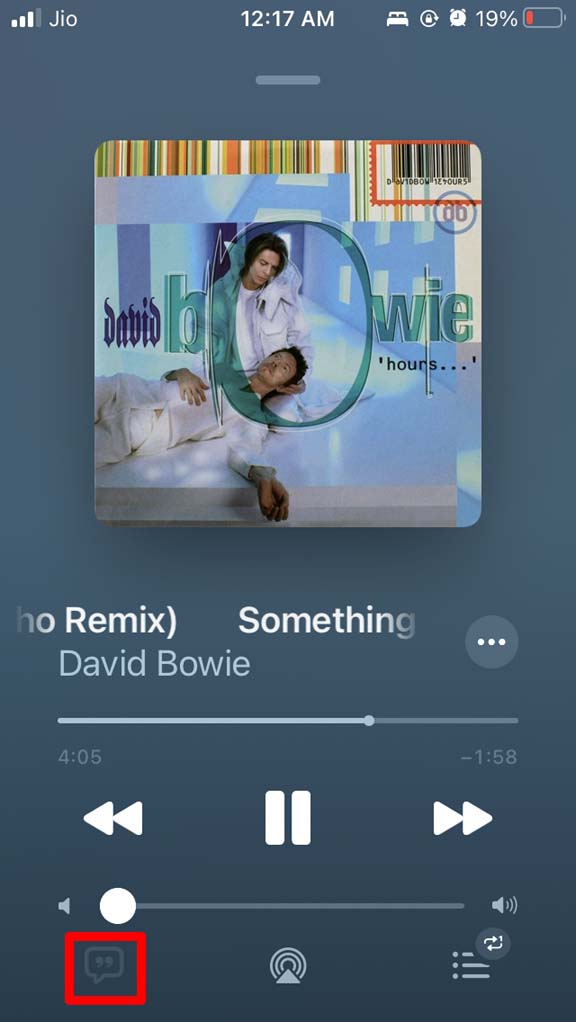 您必须打开 Apple Music,播放您的歌曲,然后点击媒体播放器下方左下角的引用按钮。