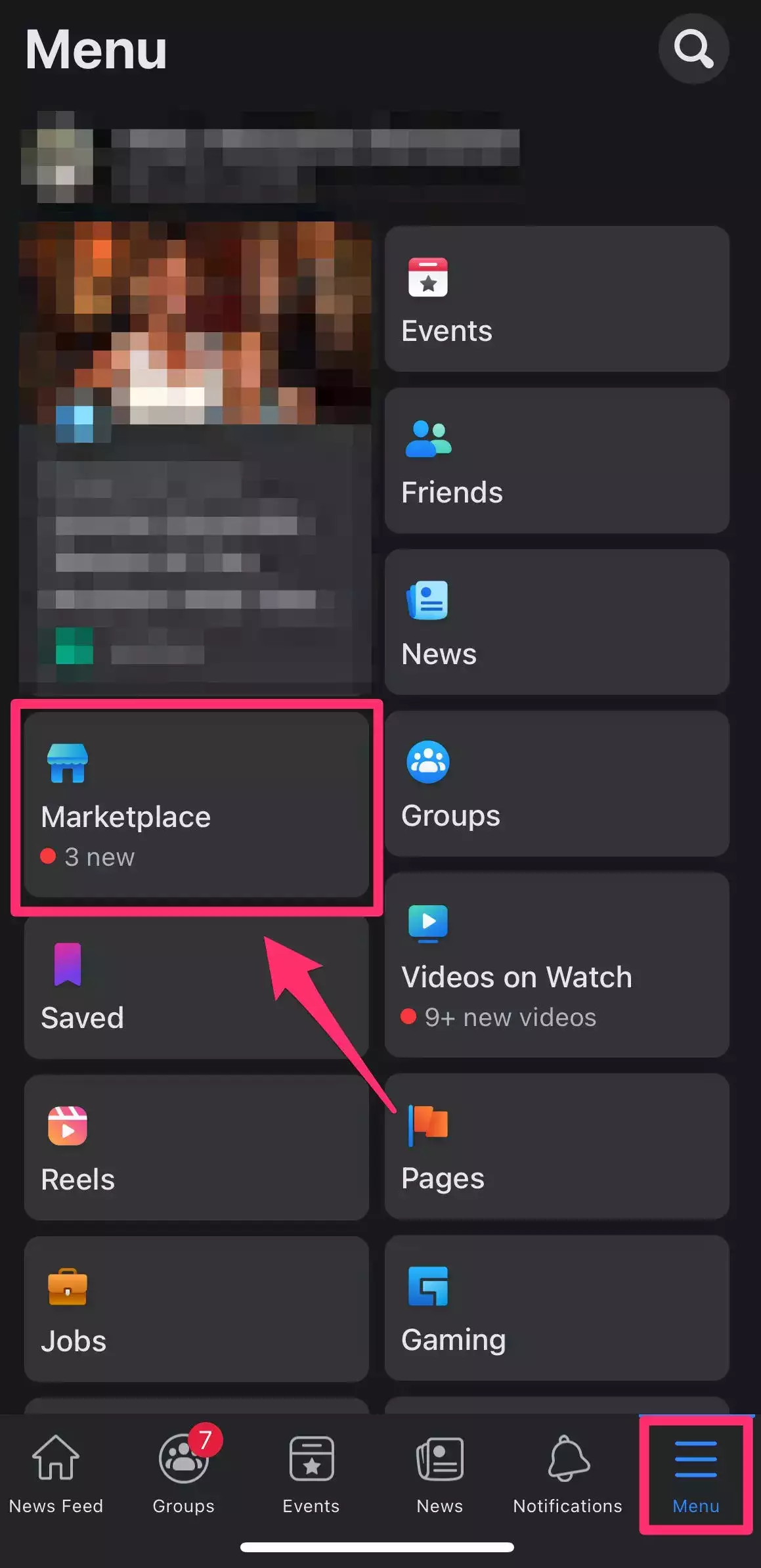 如果您使用的是 Facebook 应用程序,请点击“菜单”图标(看起来像三条水平线),然后点击“市场”。如果您没有在列表中看到它,请点击查看更多以查看完整菜单。