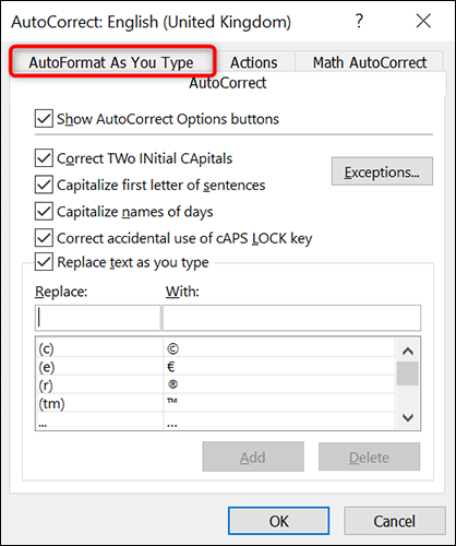 您将看到一个“自动更正”窗口。在此窗口的顶部,单击“键入时自动套用格式”。