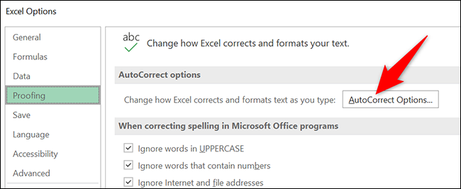 将打开“Excel 选项”窗口。在此窗口中,从左侧边栏中选择“校对”。然后,在右侧,单击“自动更正选项”。