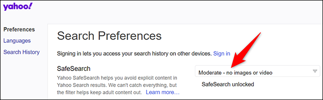 雅虎将打开一个“搜索首选项”页面。在此页面上的“安全搜索”部分,点击下拉菜单。