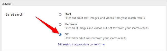 您将看到一个“搜索”页面。在这里,在“安全搜索”部分,启用“关闭”选项。这将为您禁用 Bing 上的安全搜索。