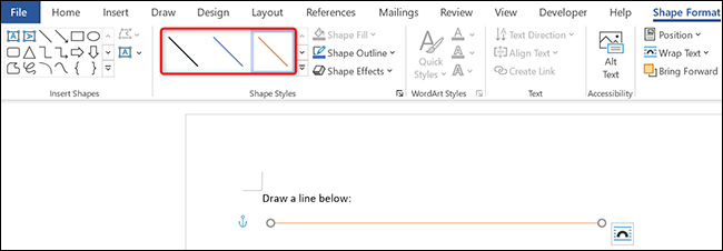 您的行现在在您的文档中可用。要自定义它,请单击线条,然后在顶部的 Word 功能区中,单击“形状格式”选项卡。