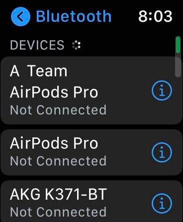 点击打开蓝牙图标,然后从设备列表中搜索要连接的蓝牙耳机。为此,请确保您的蓝牙附件可发现并且其配对设置已打开。 - 选择您的蓝牙耳机: 在列表中找到您的耳机后,点击它们即可与Apple Watch连接,瞧!您现在可以在没有iPhone的情况下在Apple Watch上播放和收听音乐!
