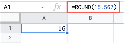 要将数字 15.567 舍入为整数,您只需将其作为第一个参数输入,而无需输入位数。这是因为places 参数默认为零。通过使用以下公式,结果为 16。