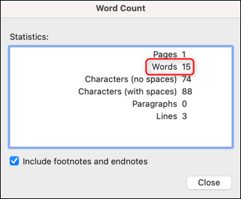 或者,打开字数统计对话框(工具 > 字数统计),然后检查字数旁边的数字。