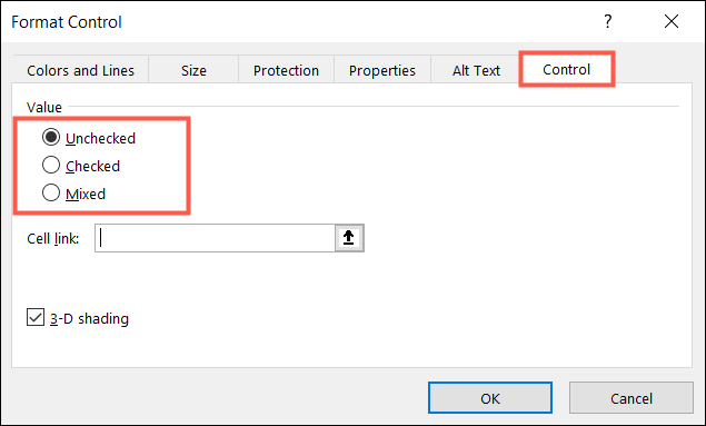 当“格式控制”窗口打开时,确认您位于“控制”选项卡上。然后,您将在顶部看到“值”选项,供您选择框的显示方式。