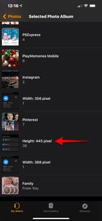 或者,您应该看到一个选项来选择包含特定宽度图像的相册。例如,可以在列表中的“高度:445像素”选项中找到Apple Watch 3的屏幕截图。如果您不想浏览“最近”文件夹中的所有图片,请点击该选项。