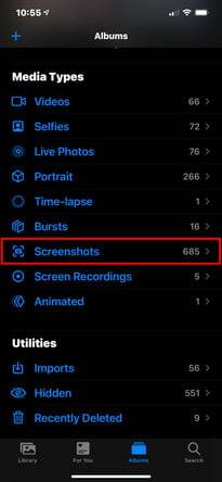 注意:屏幕快照也会与其他所有内容一起显示在“照片”应用程序的“库”选项卡中。