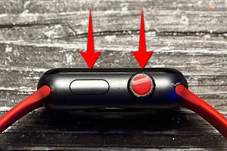 步骤5:如上在Apple Watch上所示,用两根手指同时按下侧面按钮(左)和数字表冠(右)。