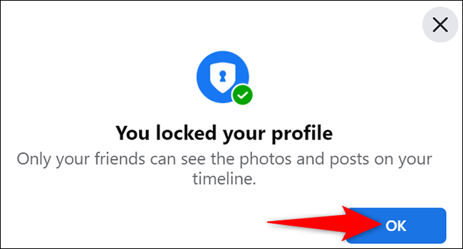 您的 Facebook 个人资料现已锁定。单击“确定”关闭锁定配置文件窗口。