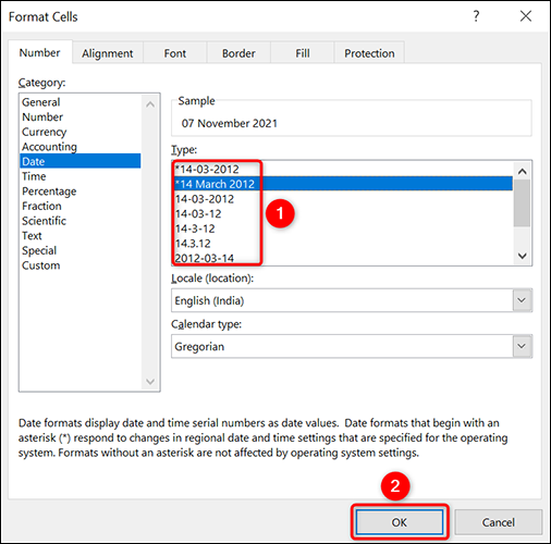 在“单元格格式”窗口中,从右侧的“类型”部分中,选择您想要的日期格式。然后点击底部的“确定”。