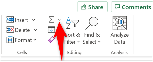 在“主页”选项卡上的“编辑”部分,选择“总和”选项旁边的向下箭头图标。