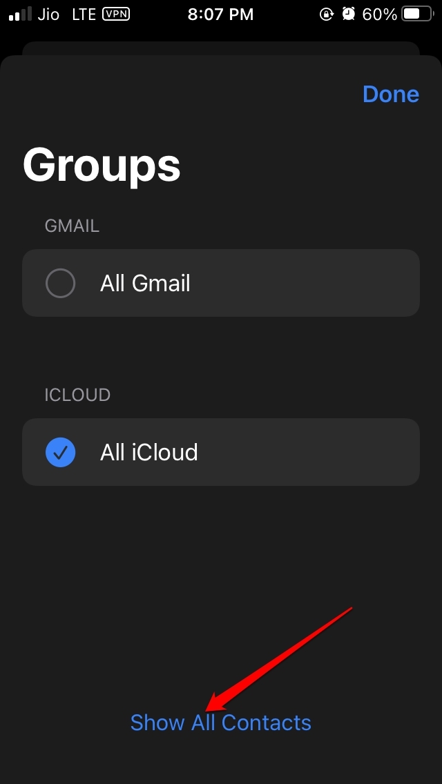 - 如果未选择其中一个帐户,您应该在屏幕底部看到一个选项Show All Contacts。点击它。