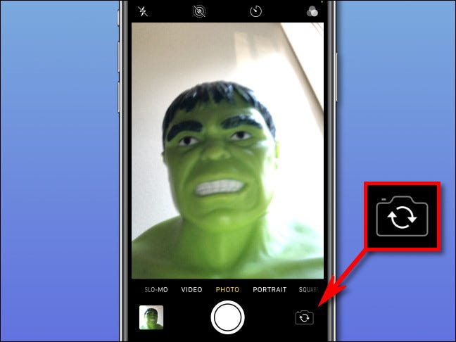 要在“相机”应用程序中在前后相机之间切换,请点击屏幕右下角的相机翻转图标。该图标看起来像一个相机的轮廓,其中有两个弯曲的箭头形成一个圆形。