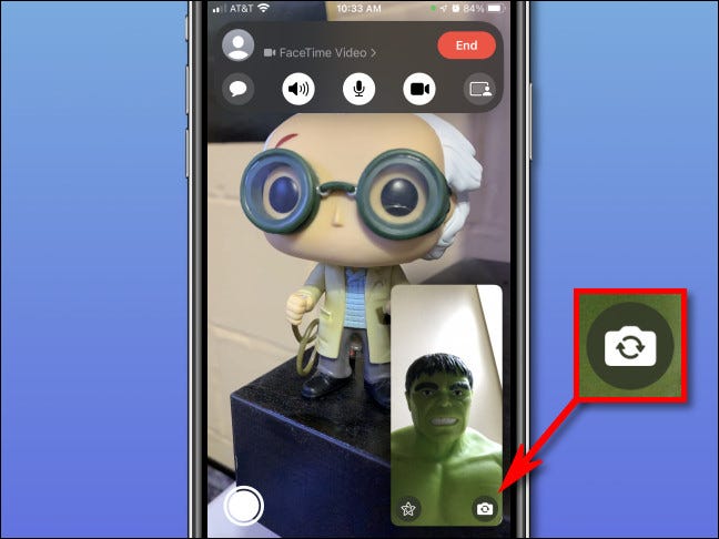为此,请先拨打 FaceTime 电话。连接后,点击屏幕一次以调出界面。这将显示以前隐藏的按钮。要在前置和后置摄像头之间切换,请在缩略图预览中点按相机翻转图标(看起来像一个带有圆形箭头的相机轮廓)。