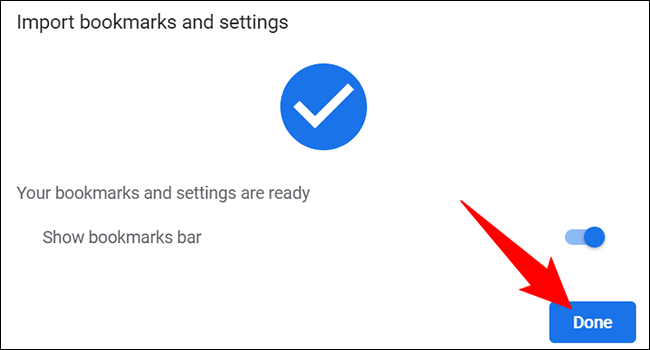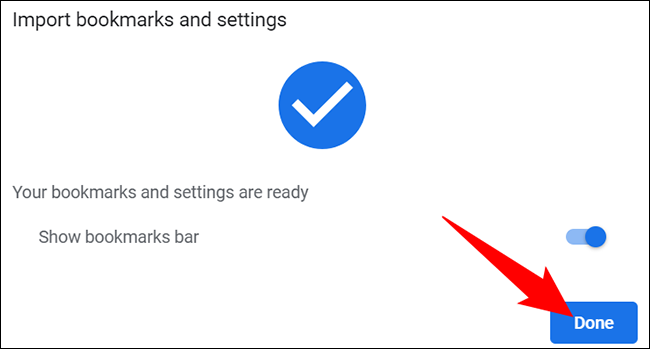 Chrome 将导入您选择的 HTML 文件中可用的书签。您将在屏幕上看到一条成功消息。要关闭此消息,请单击“完成”。