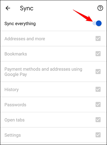 要同步您的所有 Google 帐户详细信息,包括书签,请启用“同步所有内容”选项。如果您只想同步书签,请禁用“同步所有内容”并启用“书签”。