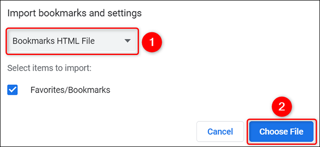 在“书签和设置”窗口中,单击下拉菜单并选择“书签 HTML 文件”。然后单击“选择文件”。