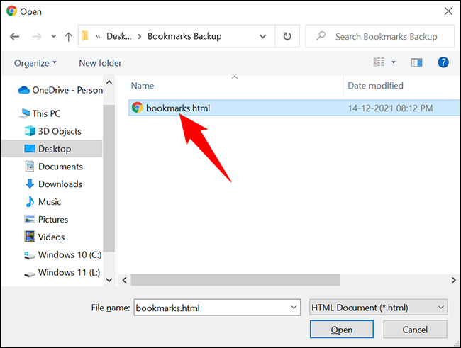 在打开的窗口中,导航到您保存书签 HTML 文件的文件夹。双击该文件以将其导入 Chrome。