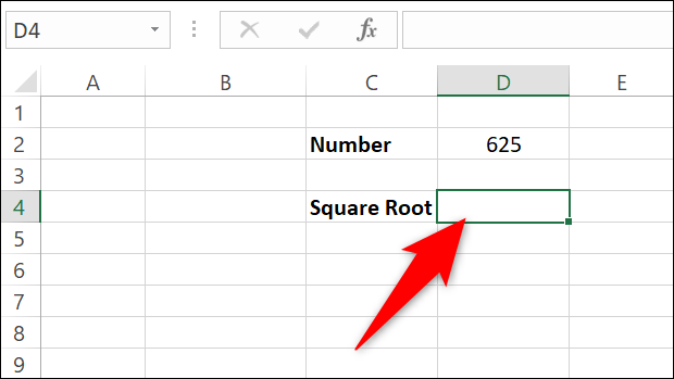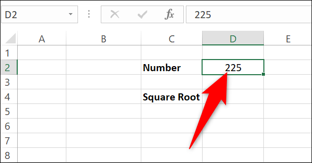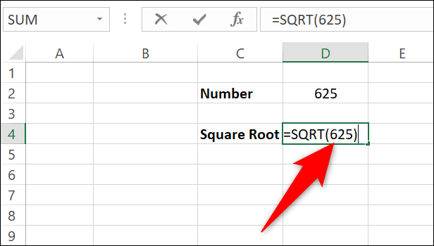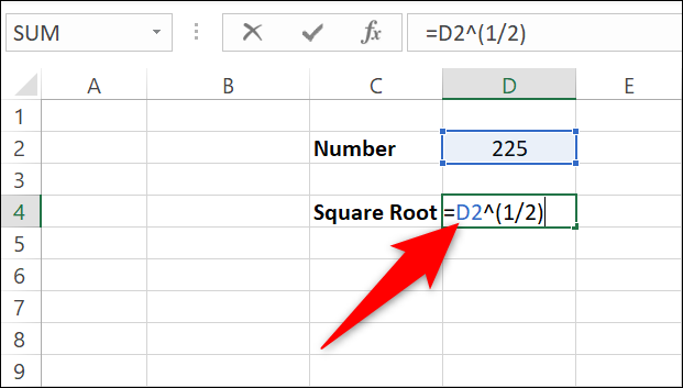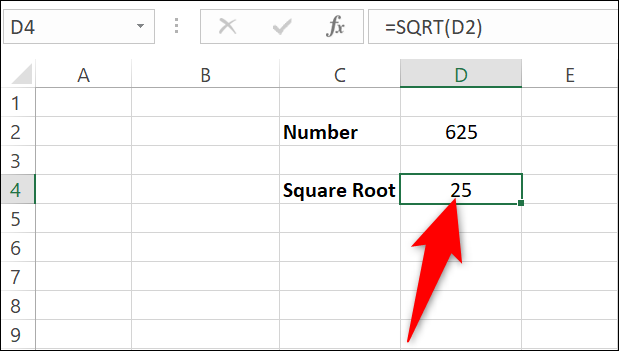 在选定的单元格中,输入以下SQRT函数并按 Enter。在此功能中,替换D2为您的号码所在的单元格。
