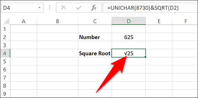 默认情况下,上述两种方法都不显示平方根 (√) 符号。要添加此符号,您可以将 Excel 的UNICHAR函数与首选的平方根查找方法结合使用。