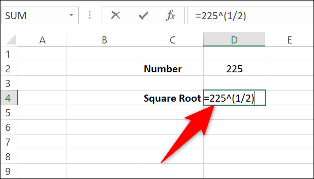 在 Excel 中查找平方根的一种方法是使用 ^(插入符号)符号。如果您不想使用专用的平方根函数(这是我们下面的第二种方法),请使用此方法。