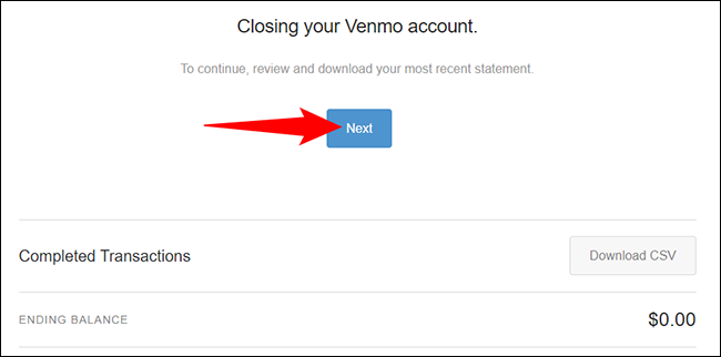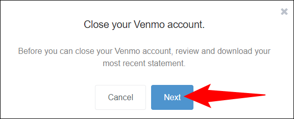 您将看到“关闭您的 Venmo 帐户”提示。在这里,单击“下一步”。