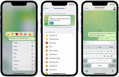 Telegram 今天宣布已更新其 iPhone 和 iPad 应用程序,增加了多项新功能,包括消息反应、翻译、隐藏文本、额外的交互式表情符号选项、用户和频道的主题二维码等。
