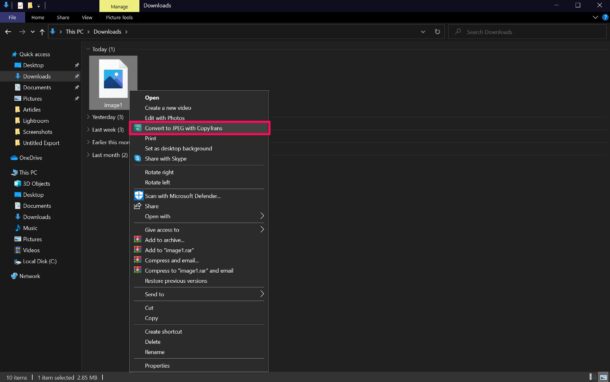 - 安装后,打开文件资源管理器并找到 HEIC 文件。现在,右键单击它并从上下文菜单中选择“使用 CopyTrans 转换为 JPEG”。