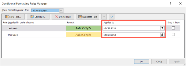 除了重新排序您的规则之外,您可能希望在某些时候停止应用列表中的规则。对于这种情况,您可以选中规则右侧的“如果为真则停止”框。然后,如果规则适用并且发生条件格式,则不会应用其他规则。